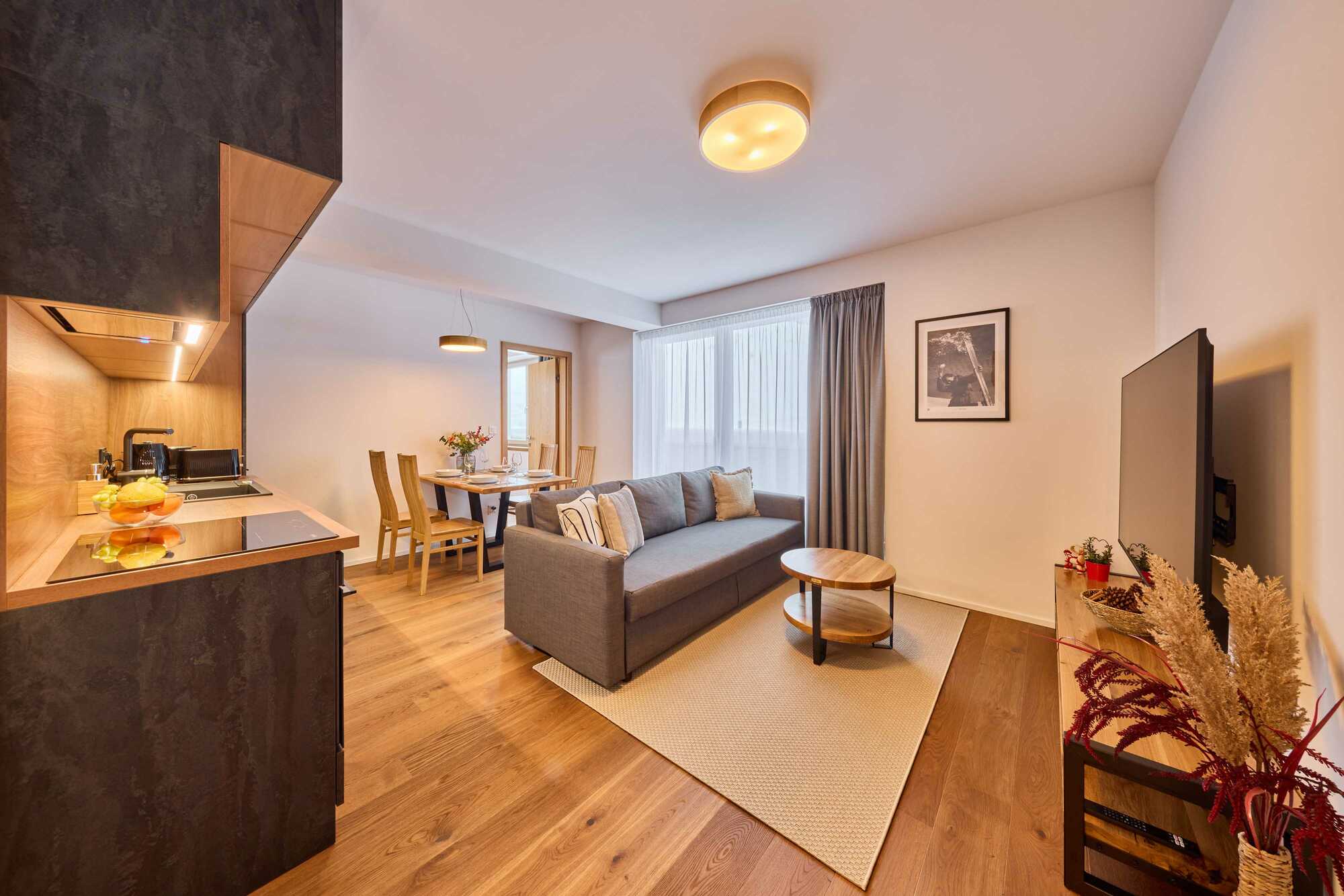 Vkusně a velmi moderně zařízený apartmán pro 2-4 osoby nabízí výhled na krásnou přírodu Pece pod Sněžkou. Prostorný obývací pokoj s plně vybaveným kuchyňským koutem, pohodlný rozkládací gauč, velká televize a jídelní stůl se židlemi, to vše je k dispozici pro společné chvíle s vaší rodinou či přáteli. Z obývacího pokoje je přistup na prostorný balkon nabízející soukromí a výhled na Pec pod Sněžkou. Venkovní nábytek ke společnému posezení je samozřejmostí. Ložnice je vybavena nábytkem z masivu a pohodlnou designovou rustikální postelí s kvalitními matracemi. V neposlední řadě je vám k dispozici koupelna se sprchovým koutem, umyvadlem a WC. K apartmánu náleží sklepní kóje k uskladnění lyží, kol a jiného sportovního náčiní. K parkování je vyhrazeno soukromé parkovací místo u budovy Krakonoš residence.